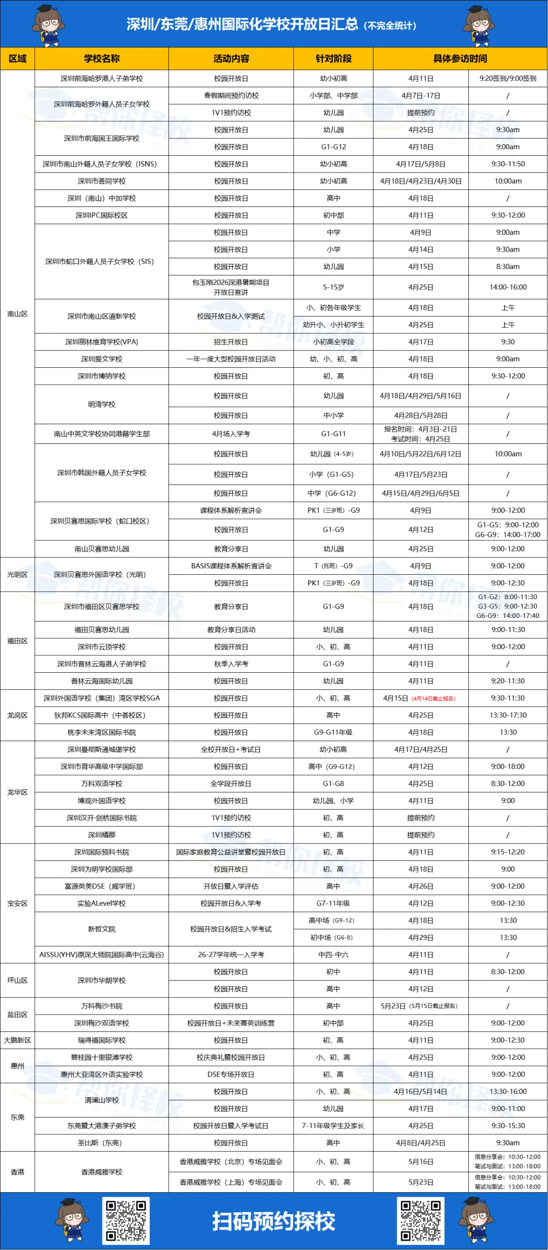 小帮妹已贴心为大家整理好4月份可预约访校的优质院校,涵盖深圳、东莞、惠州等地国际学校开放日/考试日/招生学段等信息,帮你省去繁琐查找,快速锁定心仪学校的探访机会,亲身走进校园,直观感受孩子未来的学习与成长环境。