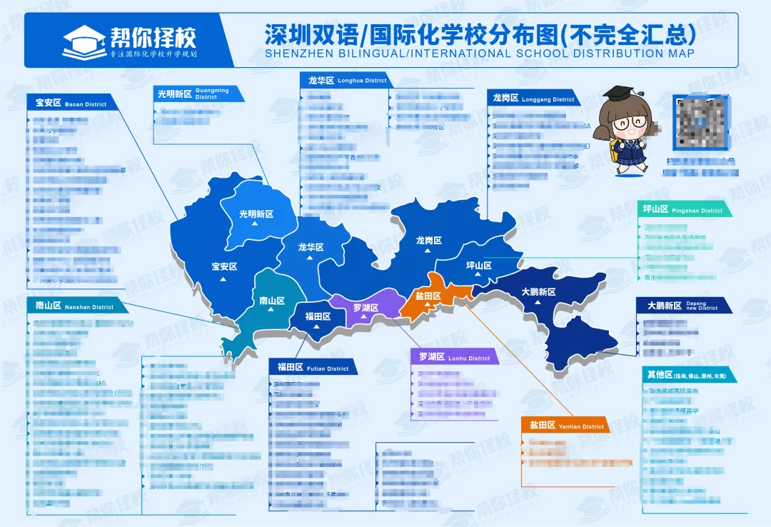 为了更方便处于择校阶段的家长们全方位了解目标学校,帮你择校还精心制作了《深圳地区双语/国际化学校分布图》(纸质版),助力家长们高效择校。