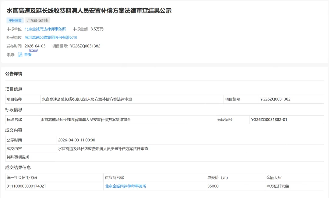 为你网罗深圳新鲜事,解锁本地生活指南,与城市共成长。"每天往返20元的通行费,是一笔雷打不动的开销。"在福田工作、家住龙岗中心城的黄先生这样吐槽。好消息来了!呼吁取消收费17年的水官高速,终于进入免费倒计时!官方承诺2026年上半年取消收费,多项准备工作已悄然启动,龙岗、横岗、坂田的通勤族们,每天省下20元的日子不远了!水官高速的BOT特许经营合同于2001年签署,25年期限至2026年初届满,因2020年疫情期间79天免费通行依法顺延,叠加深圳"2026年上半年取消收费"的官方承诺,免费倒计时已精确到月。最近的一次官方信息发布于2023年12月31日,深圳市交通运输局在公开回复中明确表示:水官高速将于2026年上半年取消收费。这相比原定25年收费期限,或提前半年结束收费历史。💡 特别提醒:本次收回属特许经营期满的正常移交,而非"提前终止回购",收费结束的具体日期将由省级主管部门提前一个月左右发布正式通告。2026年1月30日,深圳市交通运输局龙岗管理局发布《水官高速收费到期后相关事项研究项目》意向公开采购信息,预算约为410.5万元。这标志着围绕水官高速收费到期后的核心议题已转入"做功课"阶段。2026年4月3日,深圳市属国企深高速发布"水官高速及延长线收费期满人员安置补偿方案法律审查结果公示",北京金诚同达律师事务所以3.5万元中标。审查内容涉及方案整体合法性、补偿金计算规则及特殊员工风险等,标志着与运营方的补偿谈判已进入实质推进阶段。2026年1月初,龙岗区横岗街道发布的"十五五"高质量发展规划中明确:将借力水官高速市政化改造、沙荷路西延等重大交通项目,推动区域从"地理中心"向"活力中心"跃升。与运营方深圳清龙高速公路有限公司如何结算、移交,涉及资产评估与法律程序。免收费后车流量预计大幅上升,如何防止"免费了反而更堵"。1993年- 龙岗建区,决定兴建"龙岗第二通道"