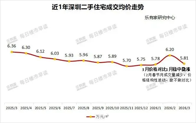 成交持续放量之下,二手住宅价格企稳,3月成交均价5.81万/㎡,除却2月份春节,自2025年12月开始保持微涨态势。