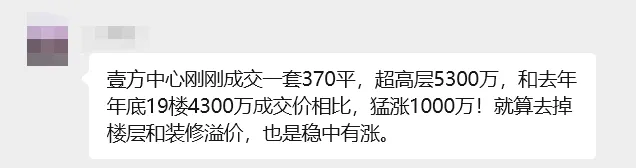 如宝中的壹方中心,3月中旬成交一套370平超高层,价格5300万,较去年年底19楼4300万的成交价,跳涨1000万。