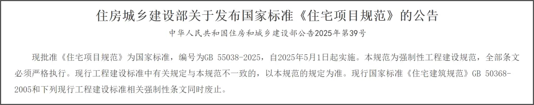 注:《住宅项目规范》为国家标准,编号为GB55038-2025,自2025年5月1日起实施。本规范为强制性工程建设规范,全部条文必须严格执行。