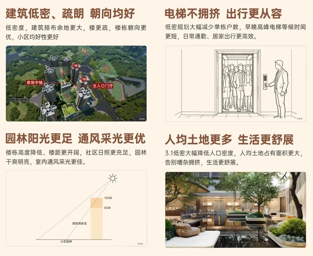 低容积率意味着什么?更舒适的人居享受:更大的楼间距、更低的人口密度、更高效的电梯乘坐体验;更优质的配套空间:园林更大且更有设计空间、公共设施更加多元;更优越的朝向视野、更高的得房率、更出色的户型。