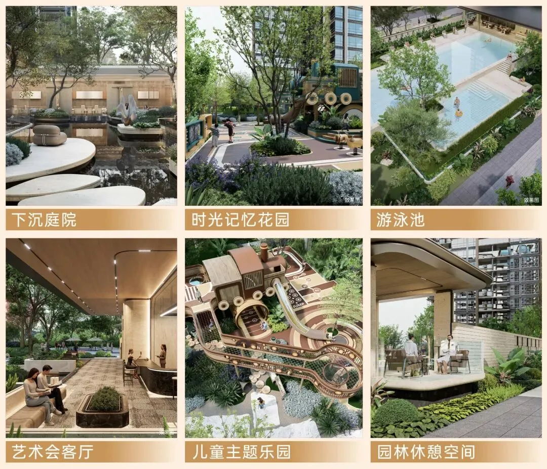 同时,因为园林规模够大,所以大手笔打造了十大主题庭院,包括下沉庭院、青年健身场、社区会客厅、亲子乐园、泳池等,能满足全龄段的社交休闲需求。