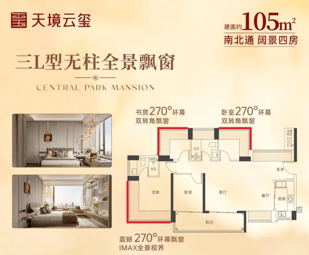 更绝的是,主卧、次卧、书房,三个转角房间拥有270°环幕飘窗,可享受极致纯粹的全景舱视野。