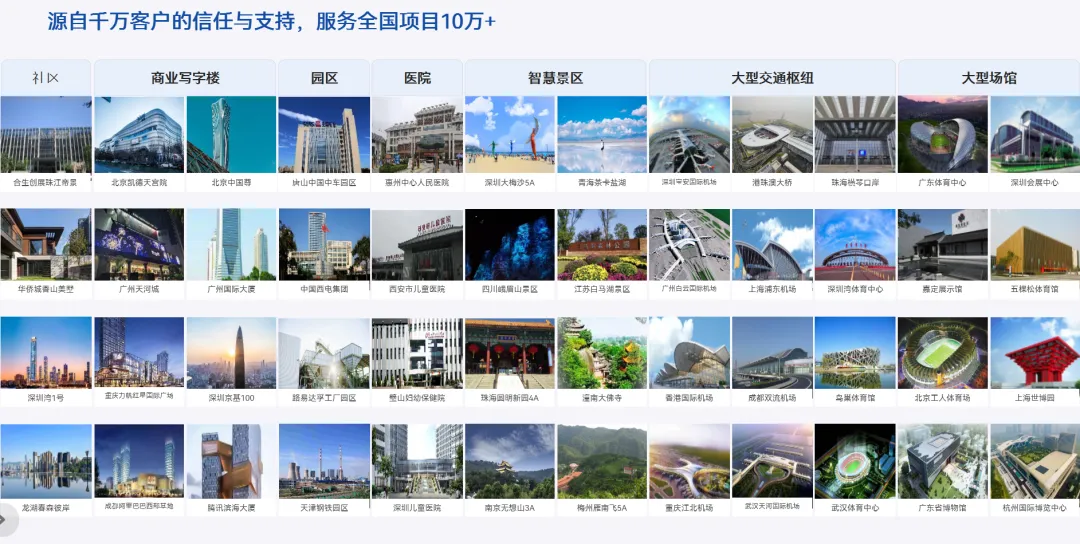 国家会议中心、港珠澳大桥、深圳 / 上海浦东国际机场、杭州亚运会场馆、茶卡盐湖、海内外大型商业综合体等。