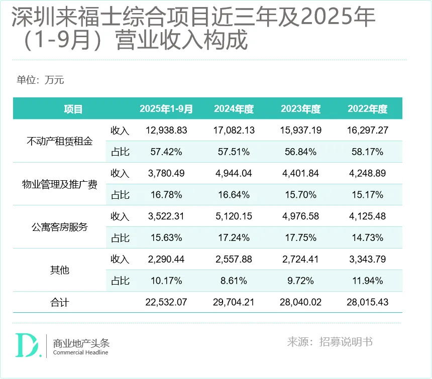 数据显示,2022年至2025年1-9月,深圳来福士营收稳步增长,其中租金收入稳定在57%左右,构成了收益的基本盘。更关键的是,非租金收入(物业+公寓+其他)占比超40%且逐年上升。