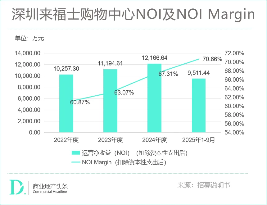 营收与NOI双增:2022-2024年营业收入从1.69亿元稳步增长至1.81亿元,年均复合增长率达3.5%。更关键的是,运营净收益(NOI)年均复合增长率达8.9%,NOI Margin(净收益率)从60.87%攀升至2025年的超70%,远超行业平均水平。