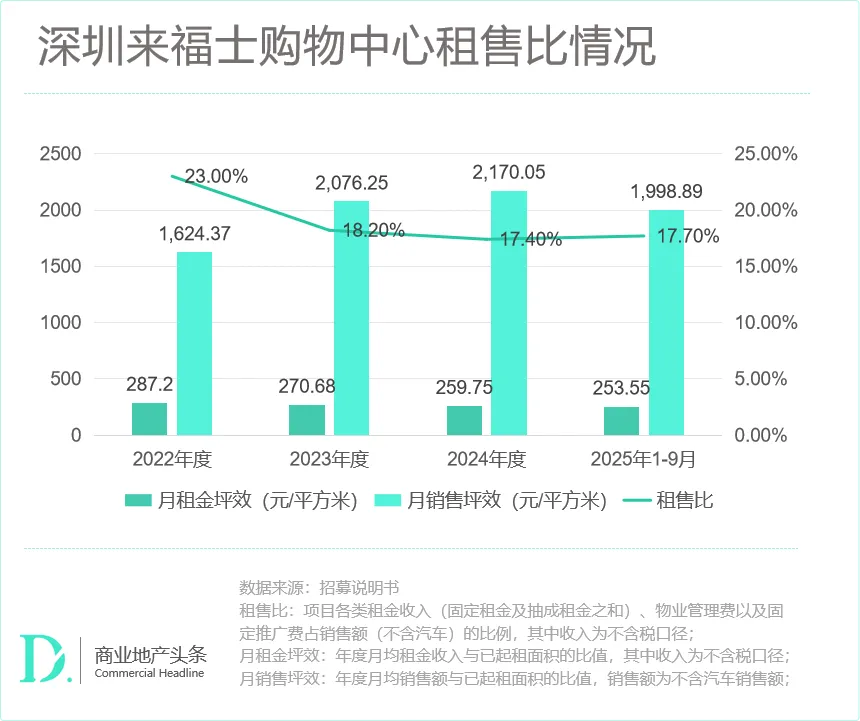 此变化亦反映在租售比同步进入健康区间。2024年到2025年1-9月,深圳来福士购物中心租售比稳定在17%左右,居商业地产普遍认可的合理区间高位(10%–20%),反映出其租金定价策略与商户经营能力之间达到了较好的平衡。