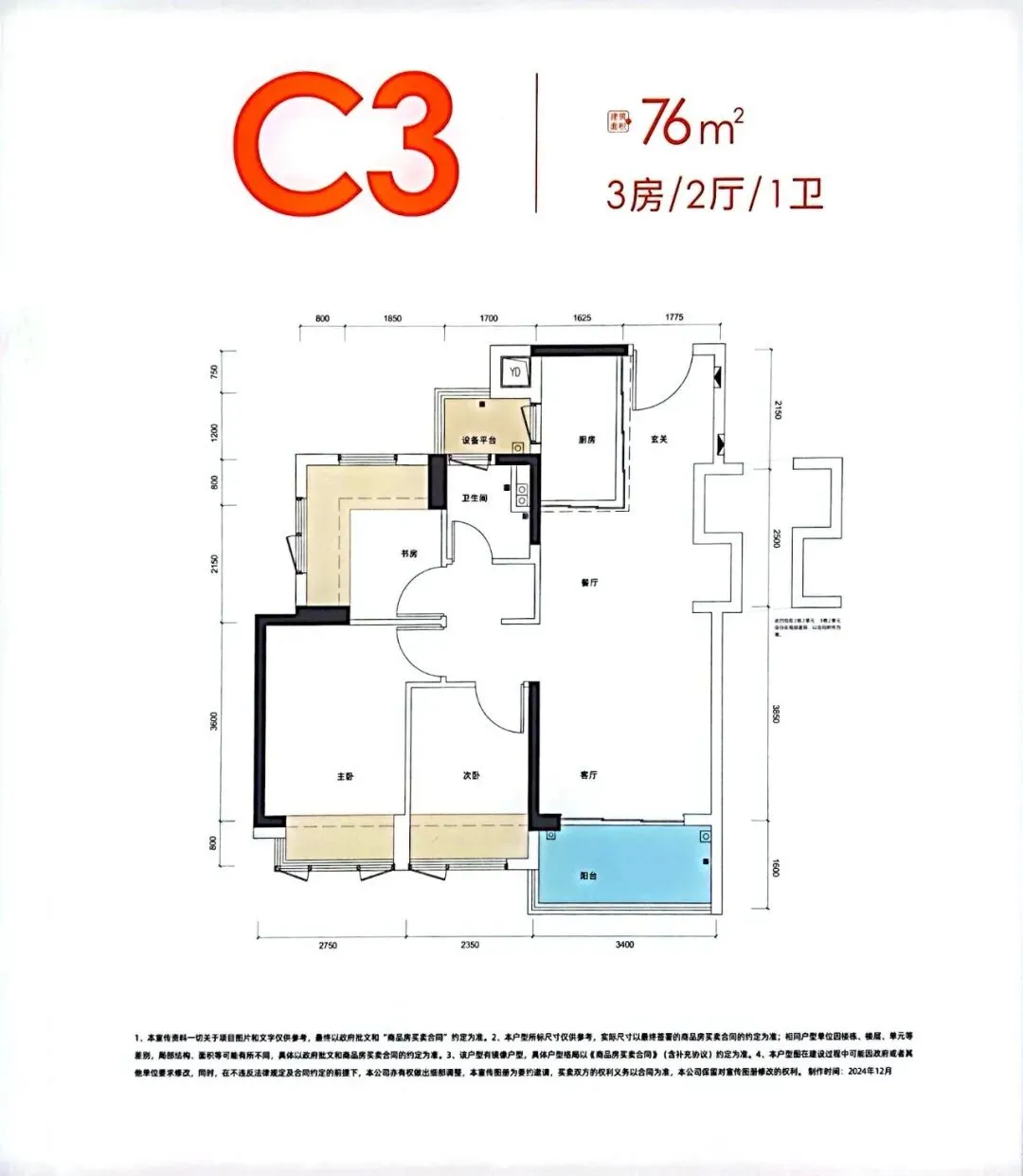 76㎡的3房2厅1卫,设计的是经典竖厅格局,客厅3.4米开间,LDKB一体化,S墙设计预留冰箱卡槽位,3个卧室分别做到了主卧10.99㎡/次卧7.3㎡/次卧5.91㎡(实测面积,去掉墙体),U型厨房,卫生间三段式分离,还带1个设备平台,赠送面积高达12.71㎡,实际得房率约97%(包含赠送),西南/东南或西北朝向。