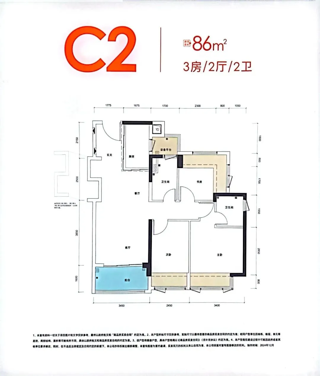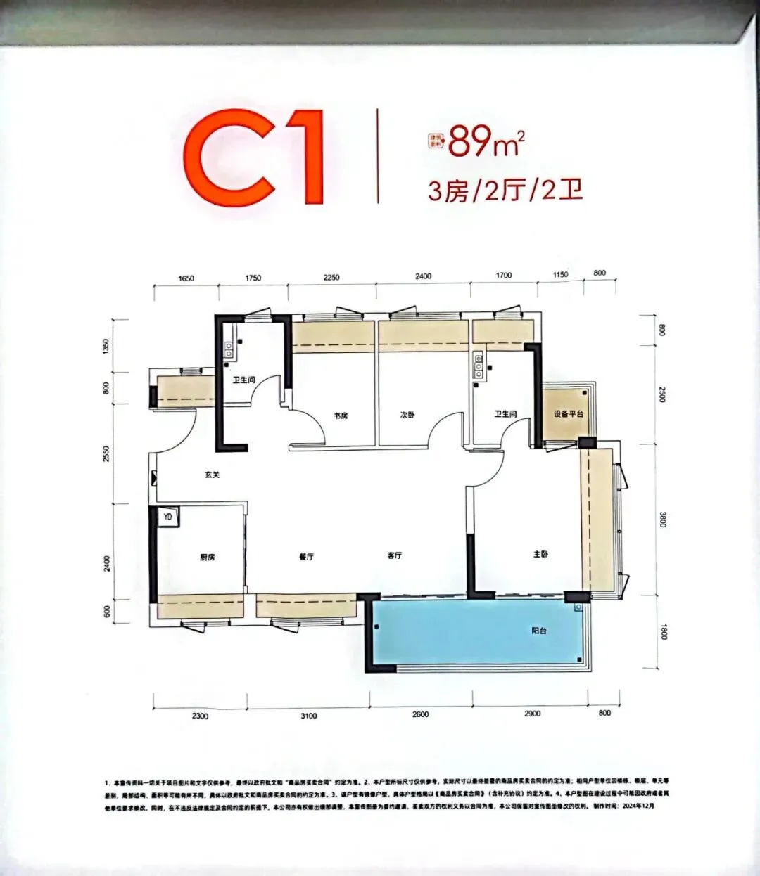 89㎡的3房2厅2卫,设计的是横厅南北通透格局,进门入户玄关,客餐厅5.7米开间,LDKB一体化,四开间朝南,3个卧室分别做到了主卧11.42㎡/次卧7.31㎡/次卧6.93㎡(实测面积,去掉墙体),主卧还带1个设备平台,主卧连接客厅出5.5米长的超大阳台,U型厨房,卫生间三段式分离,赠送面积高达20.09㎡,实际得房率约104%(包含赠送),西南/东南朝向3、项目周边配套