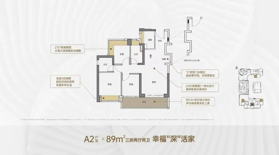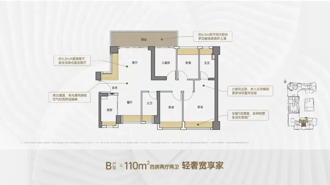 89㎡的3房2厅2卫,A2户型,设计的是竖厅格局,客厅3.5米开间,LDKB一体化,S墙设计预留冰箱卡槽位,客厅连接次卧出5.9米长的大阳台,次卧270度转角飘窗,U型厨房,卫生间干湿分离,阳台有朝西向、东向、南向。89㎡的3房2厅2卫,A1户型,设计的是竖厅格局,客厅3.5米开间,LDKB一体化,S墙设计预留冰箱卡槽位,客厅连接次卧出5.9米长的大阳台,主卧双面飘窗,次卧270度转角飘窗,U型厨房,卫生间干湿分离,阳台有朝西向、东向、南向。110㎡的4房2厅2卫,设计的是竖厅南北通透格局,客厅4.2米开间,进门户玄关,客厅连接次卧出6.5米长的大阳台,主卧大套间设计,全屋9处飘窗,U型厨房,卫生间干湿分离,阳台主朝北向。128㎡的4房2厅2卫,设计的是横厅南北通透格局,客餐厅6.5米开间,进门户玄关,LDKB一体化,客厅连接次卧出6.1米长的大阳台,主卧大套间设计,全屋8处飘窗,U型厨房,卫生间干湿分离,阳台主朝南向。