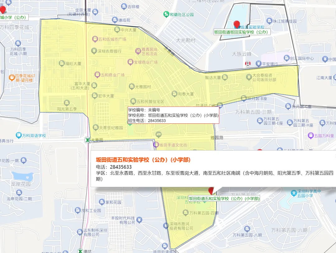 远洋天萃自带1所幼儿园,北侧地块规划有1所18班制幼儿园,小学学区划分在,科学高中五和实验学校,中学学区划分在坂田实验学校初中部,扬美实验学校初中部,深圳实验坂田校区初中部,科学高中五和实验学校初中部。