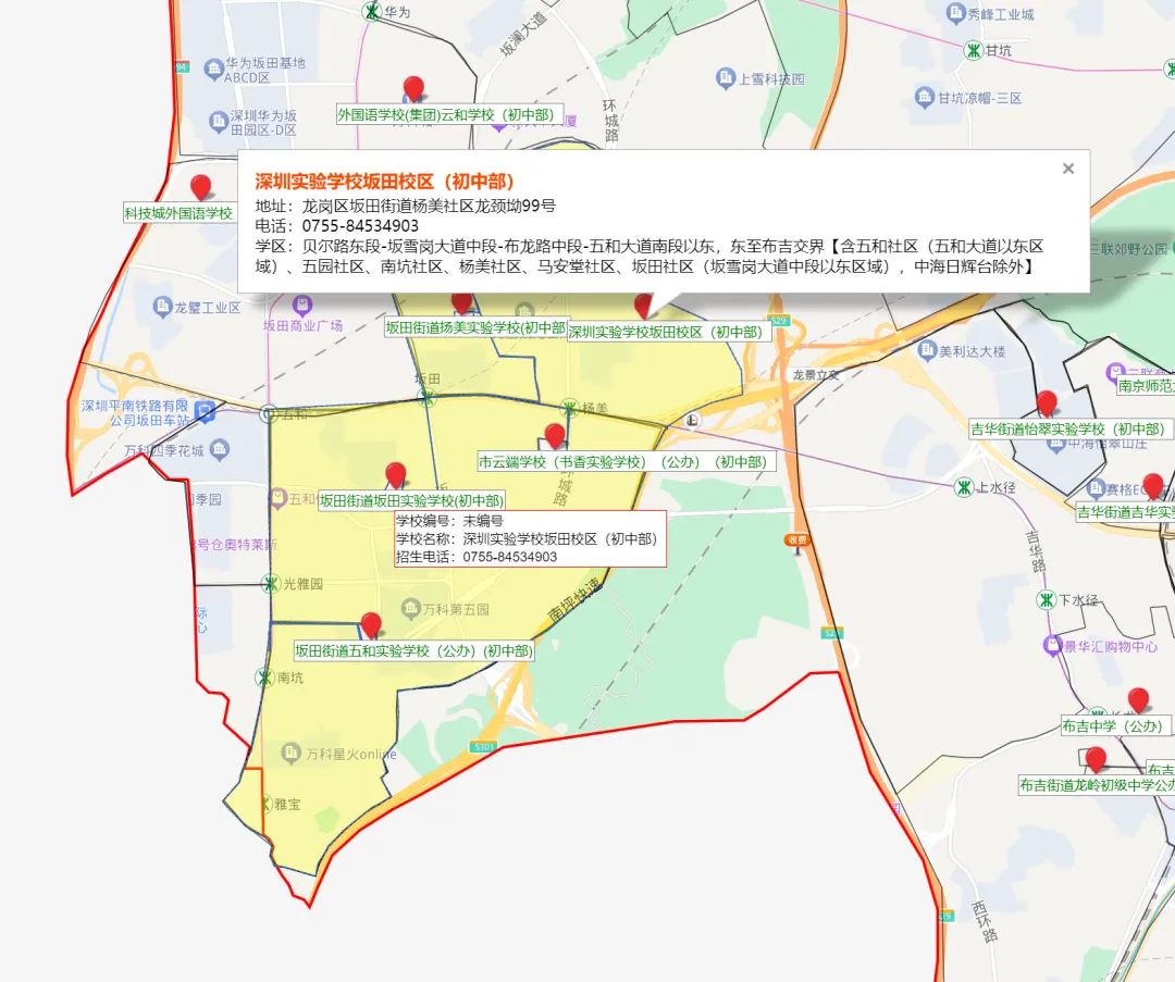其中龙岗排名前三的深圳实验坂田校区,校区和分校是完全不同的管理方式,分校是独立的组织,校区是由总部管理的。深圳实验学校坂田校区为六轨54个班的九年一贯制公办学校。学校总占地面积4.2万㎡,建筑面积2.8万㎡,运动场面积1.5万㎡,规划学位2430个,现有教工197人。学校教育教学设施按省一级学校标准建设,功能场馆齐全,设备设施先进。深实验坂田2023中考成绩:最高分585分,570以上23人;560分以上55人;550分以上93人。不过深实验坂田学校积分也比较高,据说这边目前是大学区制度,学区范围比较广所以积分也比较高,2023年入取积分高达103.15分,按目前龙岗入学积分规则学区内购房加龙岗户籍就有100分,入住一年加分只有0.6分,103.15那就是得住5年02个月才能上,除了这个学校外还有几所学校基本都能上,有坂田实验,科学高中五和实验以及云端学校(书香实验学校)这所学校也是市属学校1公里范围内有8号仓奥特莱斯及阳光湾畔、五和商业广场等小型商场,距离雅宝星河wordCoCopapk1.6公里,距离天虹商场坂田店1.8公里。项目所处位置即是深圳的“中心湖区“,沿着项目周边的4大自然生态湖泊环伺周围,包含民治水库、民乐水库、雅宝水库、南坑水库。不仅是深圳最稠密的湖区所在地,更拥有塘朗山和银湖山两大山林资源。距离天萃雅园地铁两站就是中国最高双子塔,双塔荣立,双星闪耀以369米摩天高度,打造中国最高等高双子塔,更是实力和门面形象的升级展示。