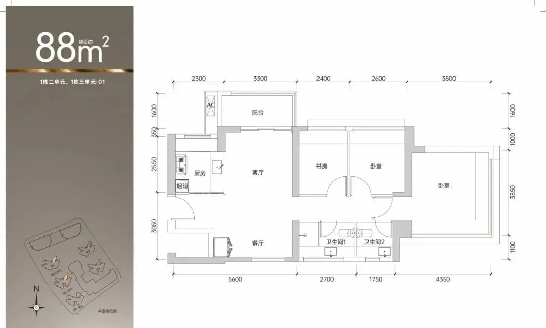 88㎡的3房2厅2卫,设计的是竖厅南北通透格局,客厅3.3米开间,,四开间朝南,主卧270°无转角飘窗,3个卧室分别做到了主卧15.63㎡/次卧7.54㎡/次卧6.96㎡(包含墙体飘窗),得房率约90%(包含赠送),阳台主朝西北或东北向。