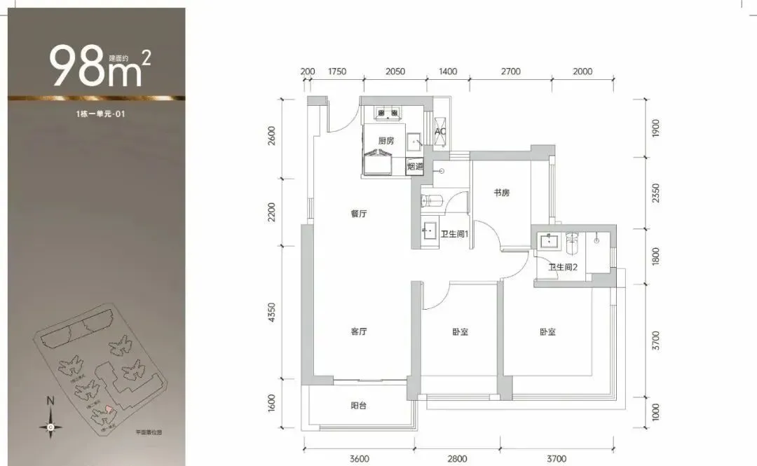98㎡的3房2厅2卫,1栋1单元01户型,设计的是经典竖厅格局,客厅3.6米开间,3个卧室分别做到了主卧14.3㎡/次卧10.36㎡/次卧6.75㎡(包含墙体飘窗),得房率约90%(包含赠送),东北朝向。
