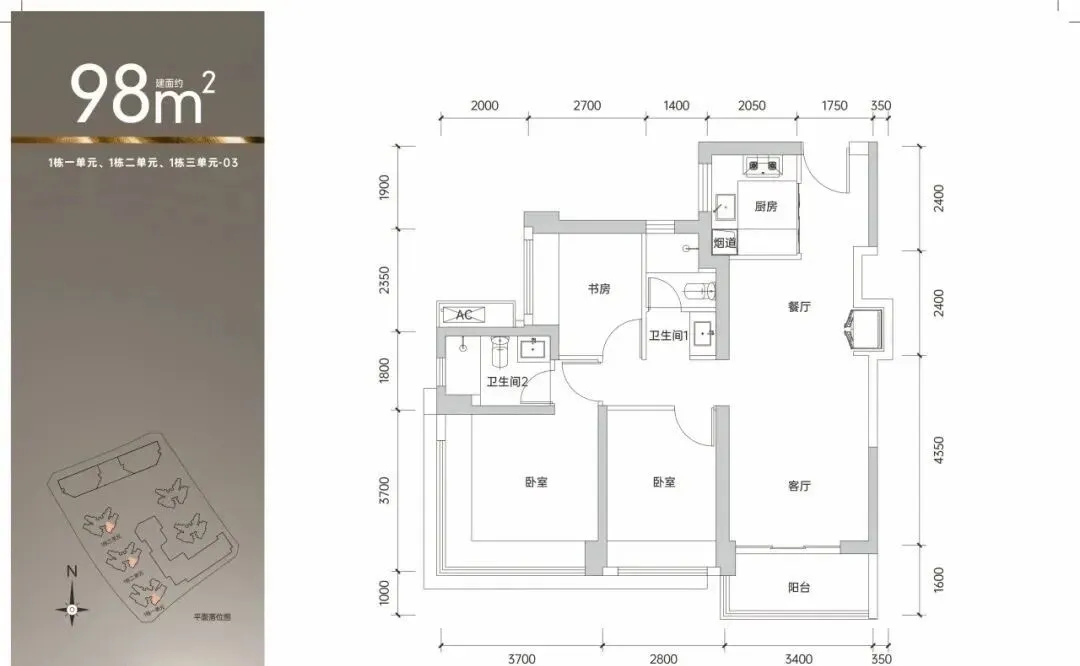 98㎡的3房2厅2卫,1栋1/2/3单元03.05户型,设计的是经典竖厅格局,客厅3.4米开间,三开间朝南,3个卧室分别做到了主卧14.3㎡/次卧10.36㎡/次卧6.75㎡(包含墙体飘窗),得房率约90%(包含赠送),东南或西南朝向。