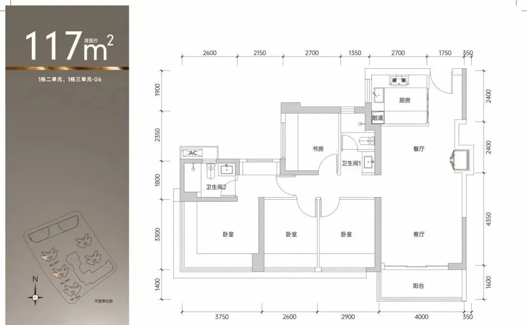 117㎡的4房2厅2卫,1栋2/3单元06户型,设计的是经典竖厅格局,客厅4米开间,四开间朝南,动静分区,4个卧室分别做到了主卧16.5㎡/次卧9.57㎡/次卧8.58㎡/次卧7.97㎡(包含墙体飘窗),得房率约90%(包含赠送),东南或西南朝向。