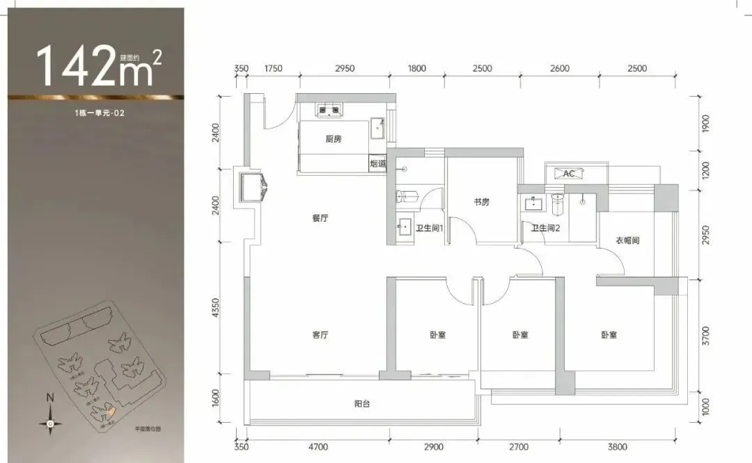 142㎡的4房2厅2卫,1栋1单元02户型,设计的是经典竖厅格局,客厅4.7米开间,四开间朝南,4个卧室分别做到了主卧24.03㎡/次卧9.99㎡/次卧8.99㎡/次卧7.6㎡(包含墙体飘窗),得房率约90%(包含赠送),东南朝向。