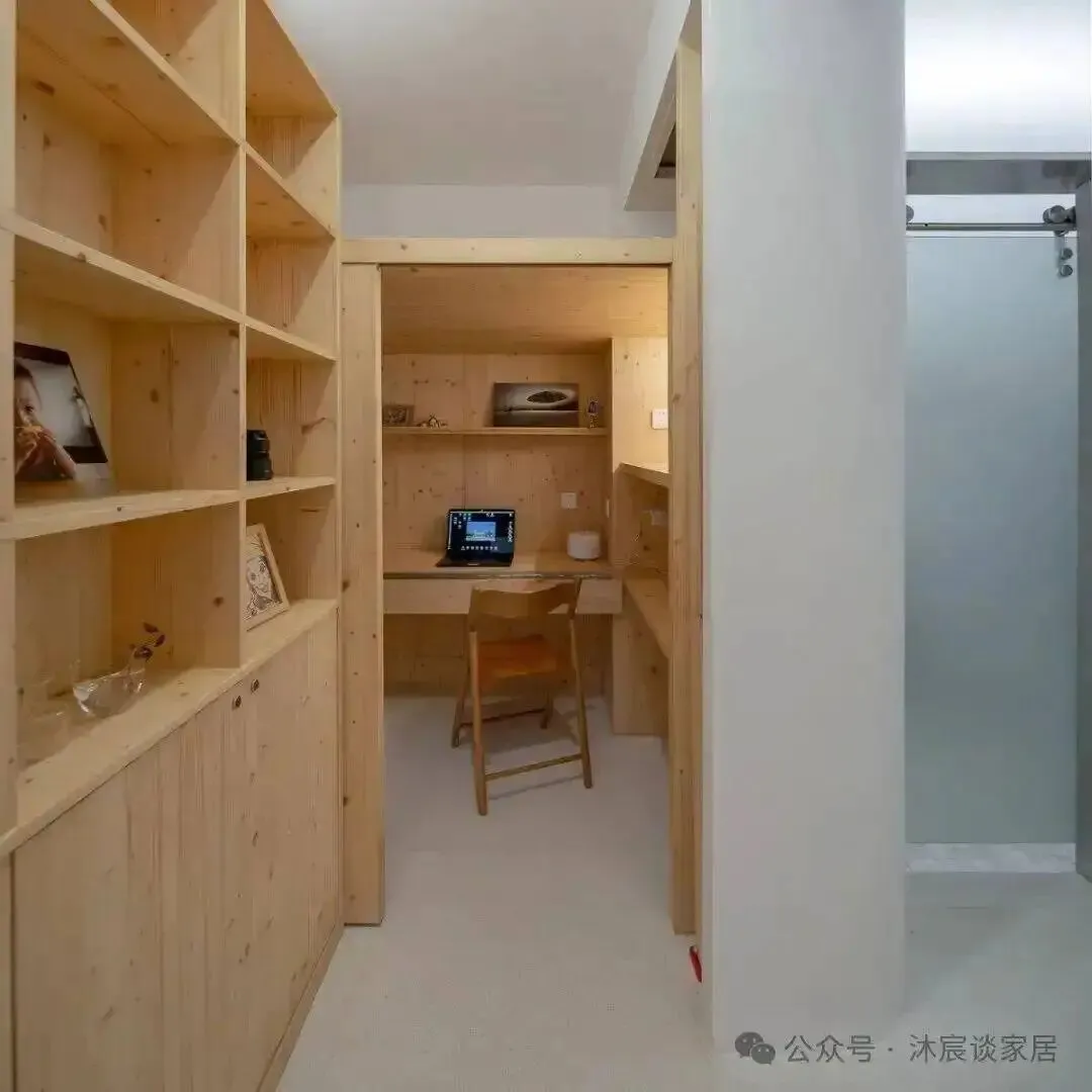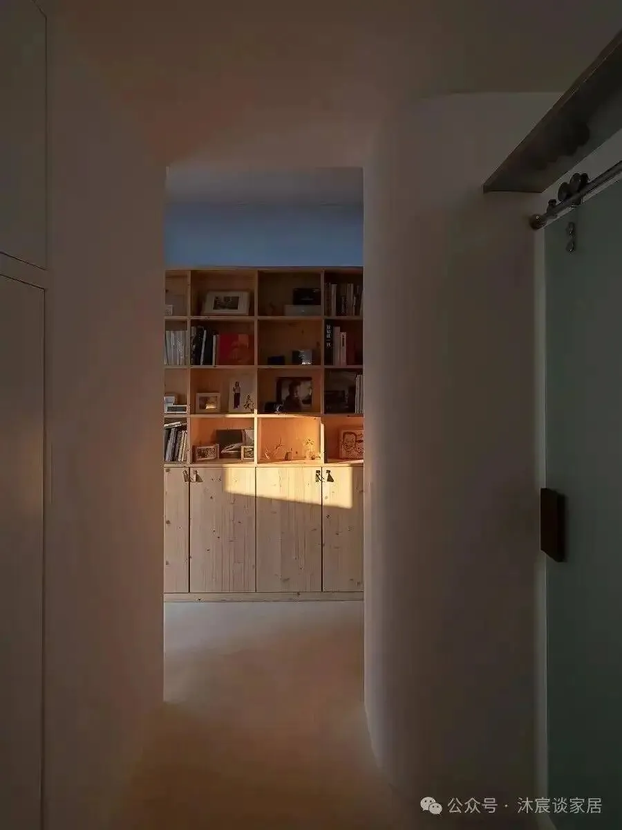 这套房的做法更高级——用柜体替代部分墙体。走廊尽头那组收纳柜,正面是书柜,背面是衣柜,两边都能用,一组家具顶两面功能。