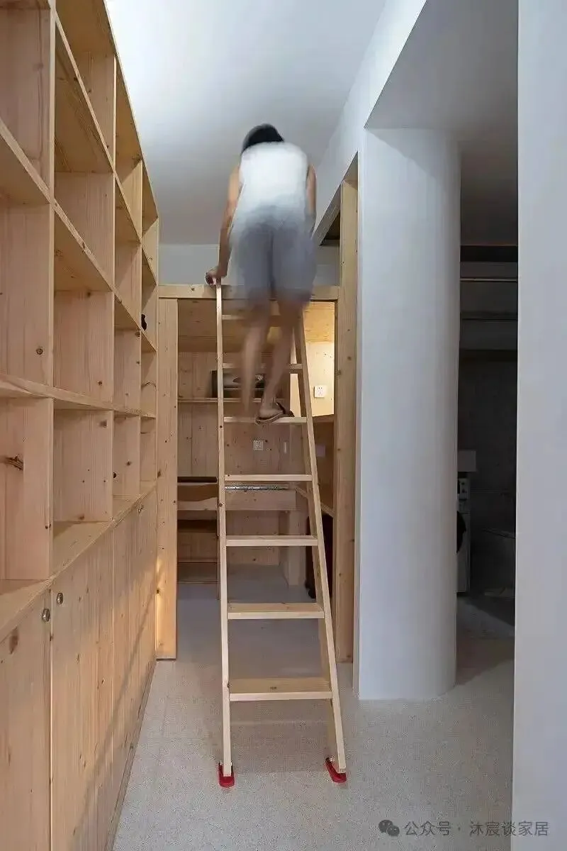 连楼梯都没浪费,下面继续做储物。小空间设计的终极思路,就这一句:不要让任何体块只完成一种任务。