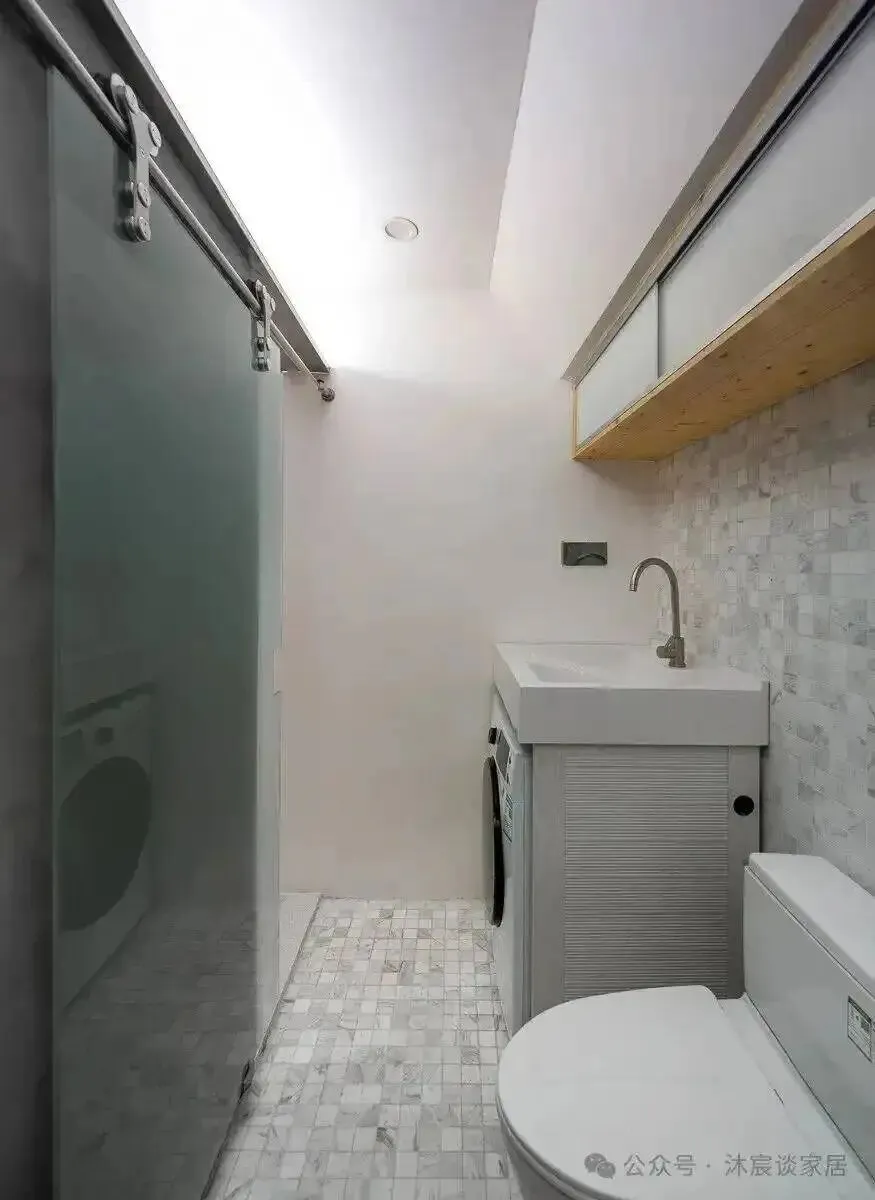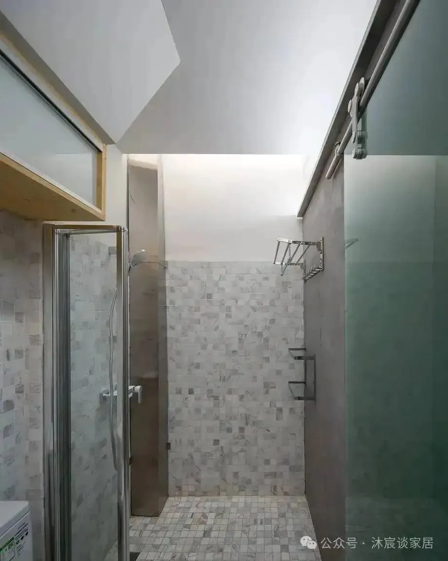 卫生间因为是暗卫,所以重点不是装饰,而是补光。门用磨砂玻璃,内部淋浴区再配合折叠亚克力门,让有限的光线尽量走得更深一些。