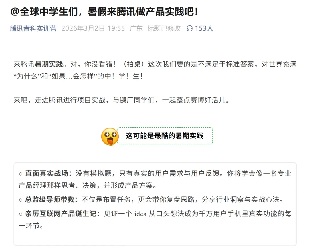 “青科实训营”,13岁就能报名。进去之后,总监级导师亲自带,做的不是模拟题,而是真实的产品。金融科技、AI教育、微信搜索……这些岗位,你家孩子也能去。