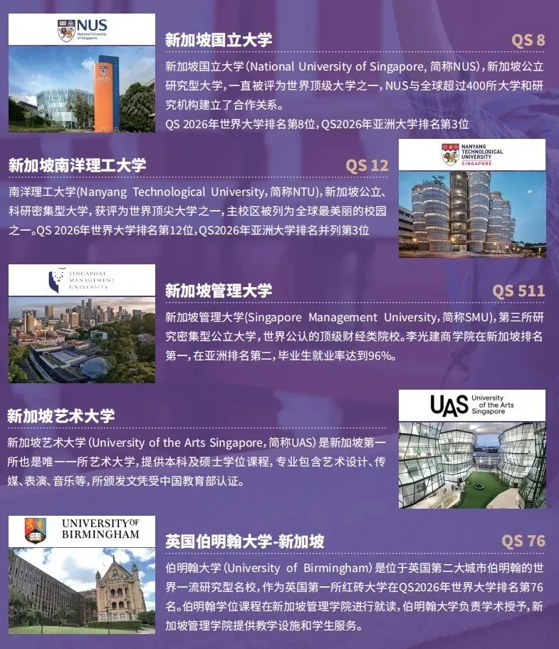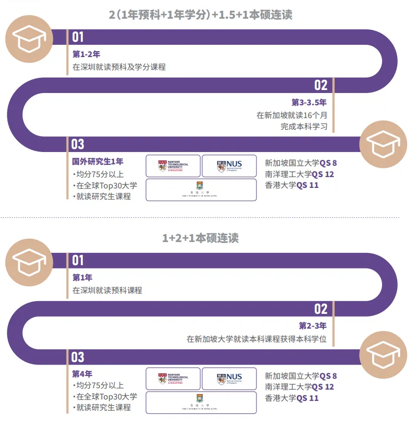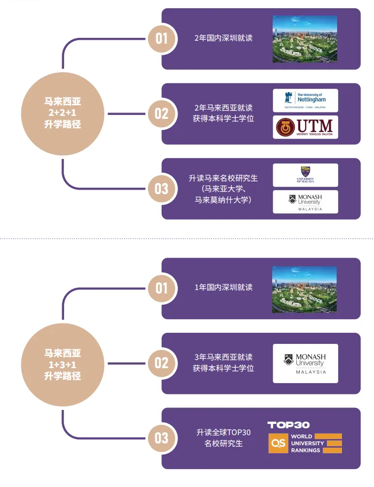 马来西亚、新加坡院校深度合作定向培养,海外院校全球化升学;学生完成国内课程达到海外院校入学要求,100%确保入学名额;升学海外合作院校均受中国教育部认可,学成归国后学位均可获中国教育部认证,享受留学生多项待遇。