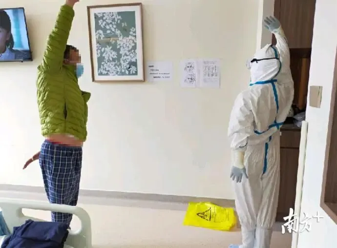 隔离病房活动范围小,患者们天天躺在床上,不仅腰酸背痛,胃口不好,排便不畅成了困扰他们的一大问题。病区中医科的专科护士教他们做操、打拳,学习八段锦。她穿着笨重的防护服,穿梭在每个病房,打起拳来一招一式都略显憨态,惹得叔叔阿姨笑声不断。对着天天玩手机的年轻人,她又化身理疗行家,为他们进行头部穴位按压,缓解他们头昏脑涨、视力模糊的症状。