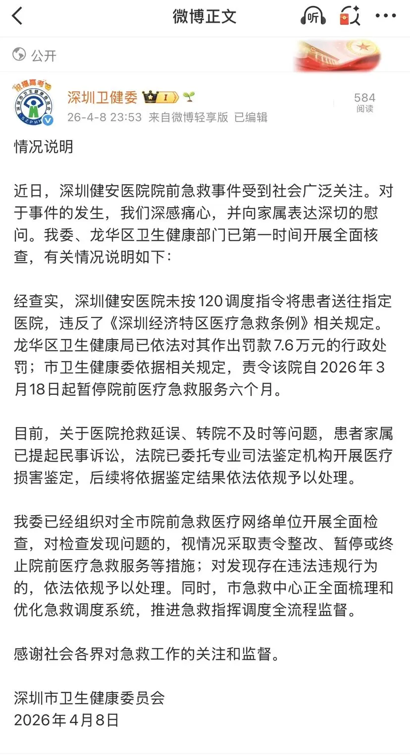 经查实,深圳健安医院未按120调度指令将患者送往指定医院,违反了《深圳经济特区医疗急救条例》相关规定。龙华区卫生健康局已依法对其作出罚款7.6万元的行政处罚;市卫生健康委依据相关规定,责令该院自2026年3月18日起暂停院前医疗急救服务六个月。