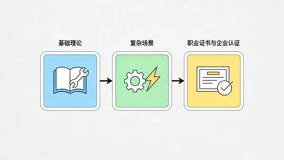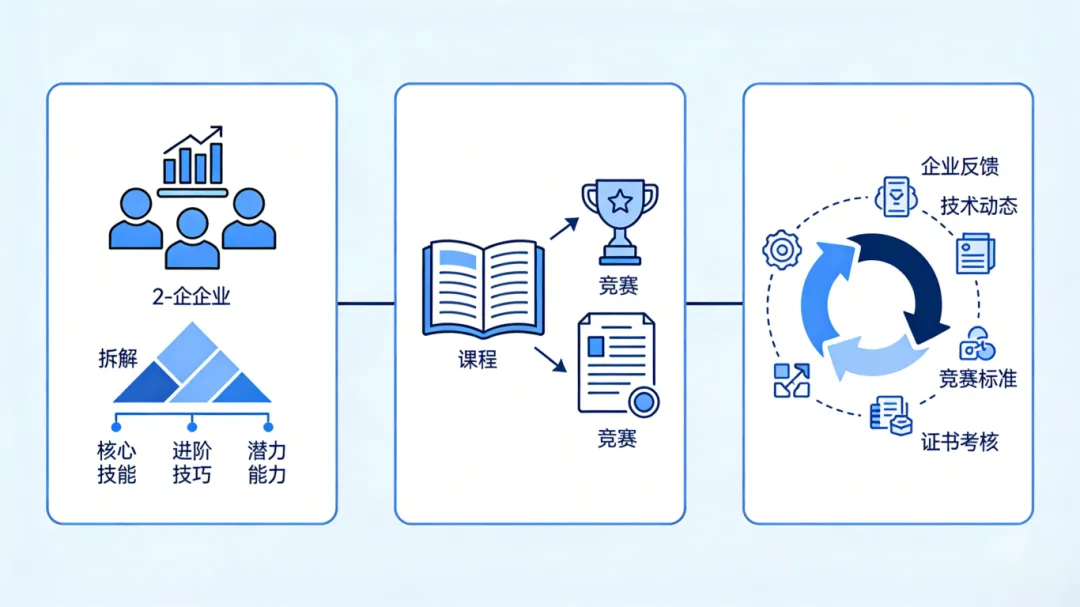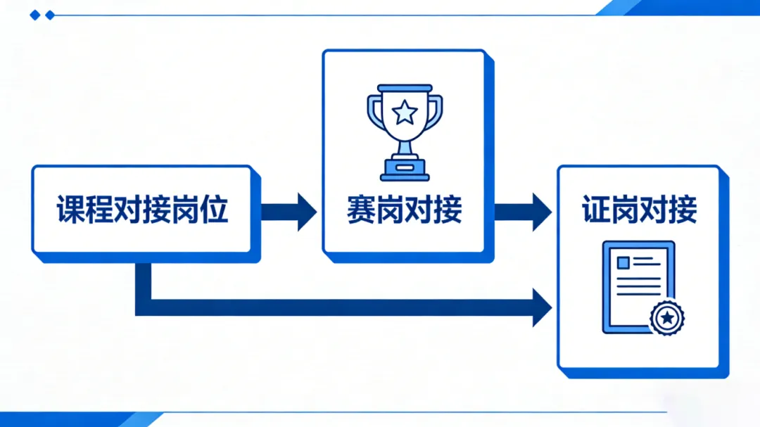 将拆解后的能力清单转化为具体的课程模块与实训任务,确保课程内容与岗位能力一一对应;再筛选与岗位、课程匹配度高的技能竞赛赛项,将竞赛核心要求融入高阶实训;最后绑定对应的职业资格证书或企业专项认证,让课程训练、竞赛备考、证书备考形成统一目标,避免内容脱节。