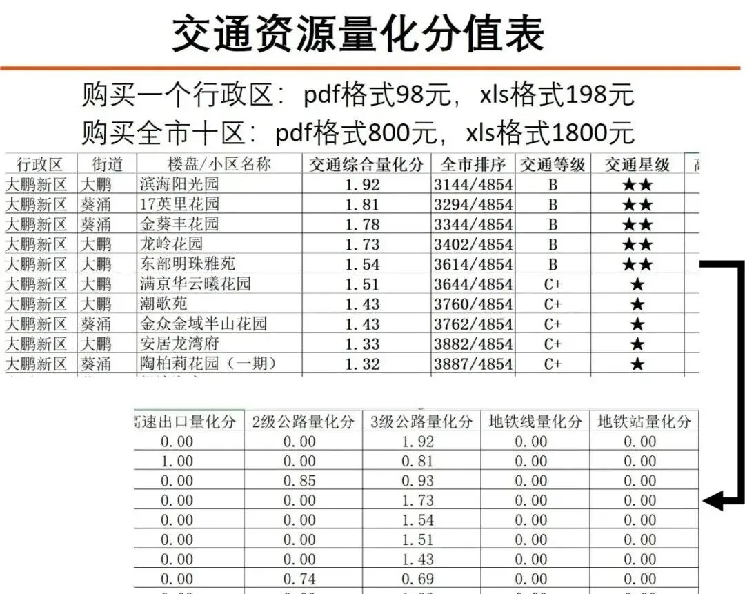 您可购买《深圳居住小区交通资源量化分值表》,购买后收到的数据成果如下表(可选择不同维度、不同区域、不同的格式):