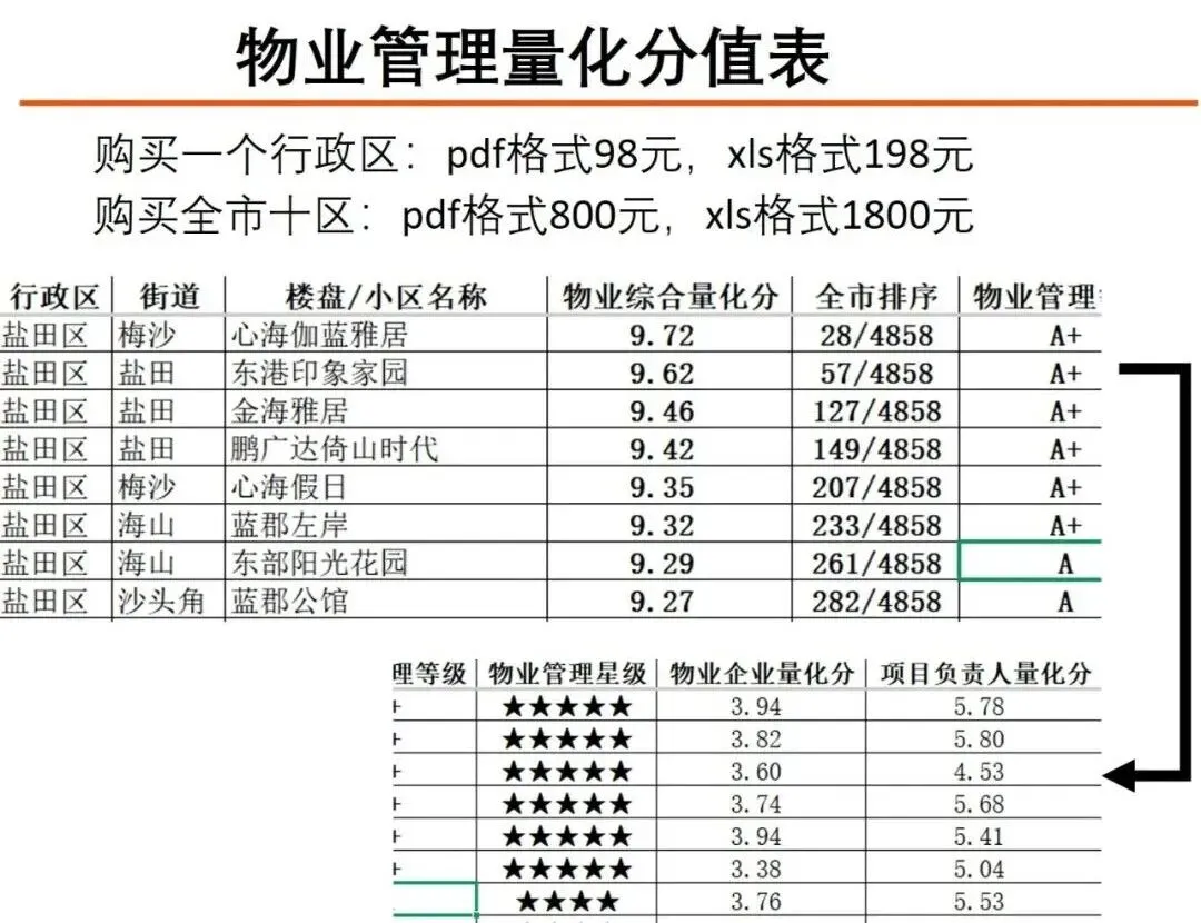 可购买《深圳居住小区物业管理量化分值表》,购买后收到的数据成果如下表(可选择不同维度、不同区域、不同的格式):