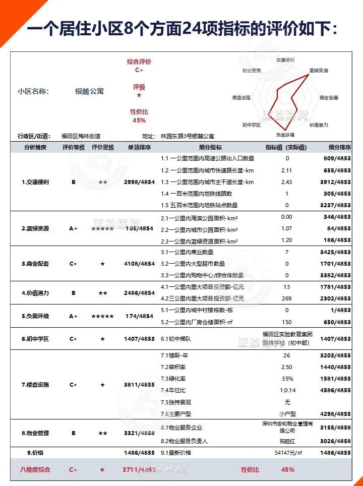 根据以上8个维度量化分,您可以对一个小区进行全方位的优劣势分析如下: