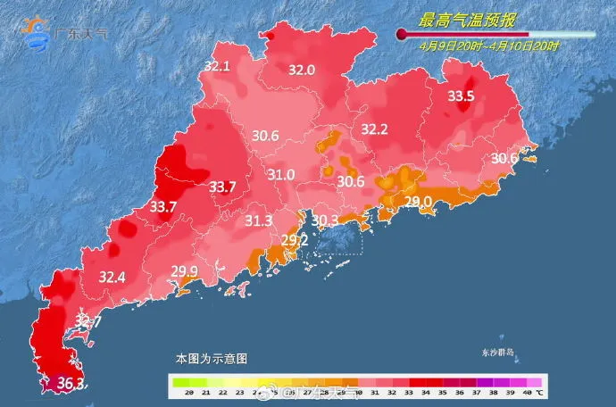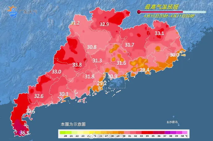 11日,韶关、清远、肇庆北部市县多云间阴天,有分散(雷)阵雨,其余市县多云间阴天,局部有(雷)阵雨,早晚有轻雾或雾。白天最高气温:雷州半岛34-36℃,南部沿海市县27-30℃,其余市县30-34℃。