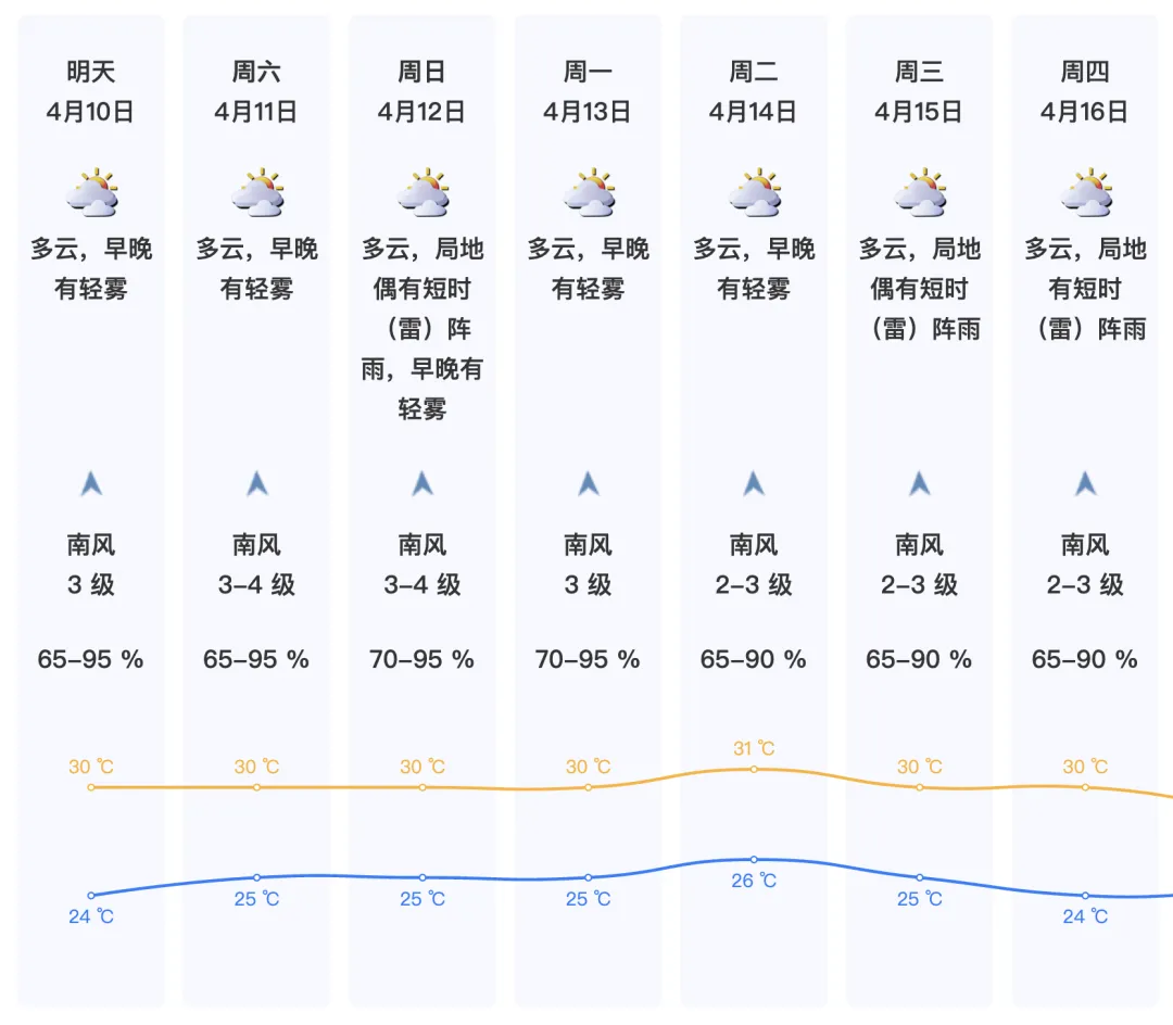 10-13日多云为主,间中局地有短时(雷)阵雨,早晚有轻雾,白天体感较热或炎热。