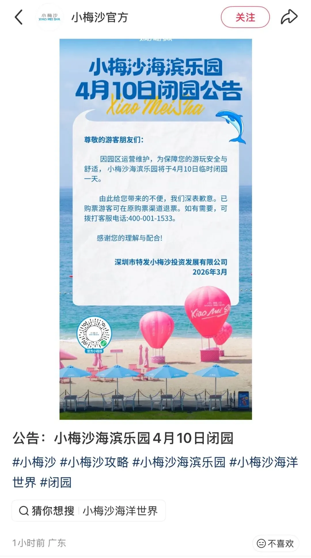 小梅沙官方小红书发布公告: