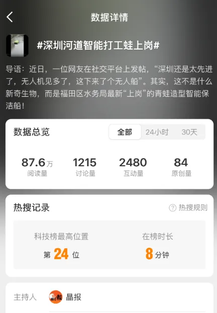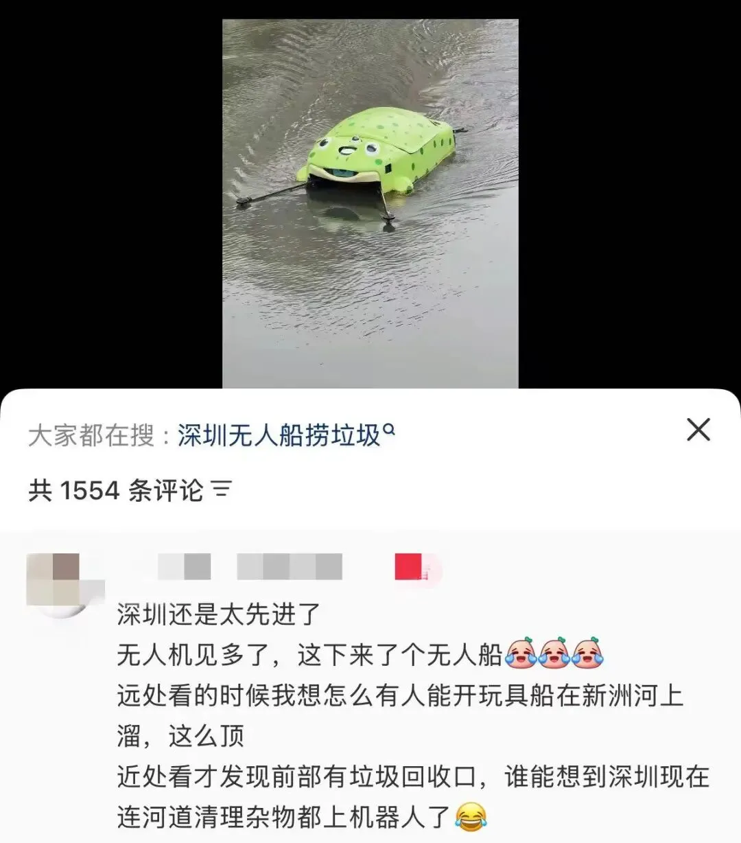 近日,有网友在新洲河偶遇一艘超萌无人船,它顺着水流缓缓航行,圆滚滚的机身自带垃圾回收口,像个不知疲倦的“打工蛙”,将水面落叶、杂物一网打尽。呆萌的造型圈粉无数,网友直呼:“深圳还是太先进了”。话题一度登上微博同城热搜榜。(此前报道:“呱呱呱!”深圳惊现“打工蛙”!很多人遇到了……)