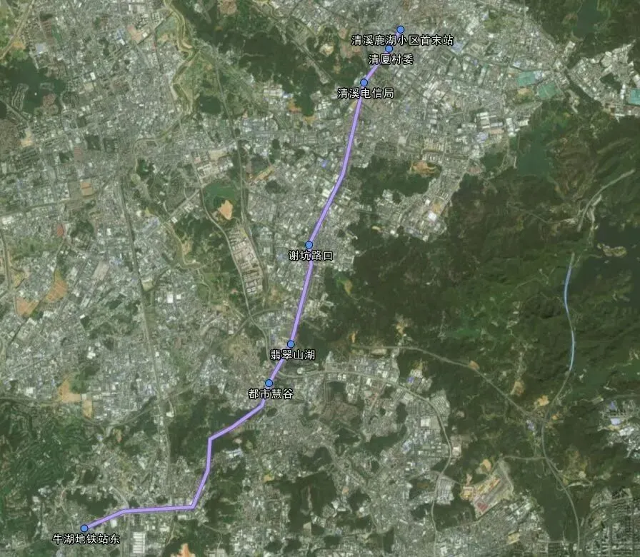 清溪鹿湖小区首末站↔清厦村↔ 清溪电信 ↔谢坑路口↔翡翠山湖↔都市慧谷↔牛湖地铁站(往返同途)