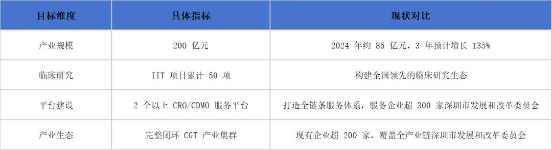 深圳已汇聚细胞与基因企业超 200 家,2024 年产业总营收超 85 亿元,随着 "细胞十条" 落地,到 2028 年将实现产业规模翻番(突破 200 亿元),IIT 项目数量全国领先,建成具有国际影响力的 CGT 产业集群,带动粤港澳大湾区生物医药产业整体升级。