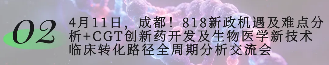 为精准把握细则核心要求,厘清临床研究备案与转化应用的具体流程、费用构成及未来发展方向,海南博鳌乐城医学公益基金会计划在成都组织“818新政机遇及实操难点分析+CGT创新药开发及生物医学新技术临床转化路径全周期分析(包括临床过程,项目投入费用及开发周期等)”交流会,特邀行业同仁参与本次研讨会,共同解读 818 号令细则条款、研判行业发展方向,明确新技术转化应用所需的技术储备与资金规划方案,明晰企业发展路径。