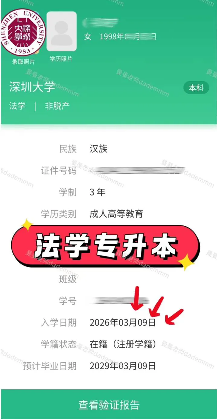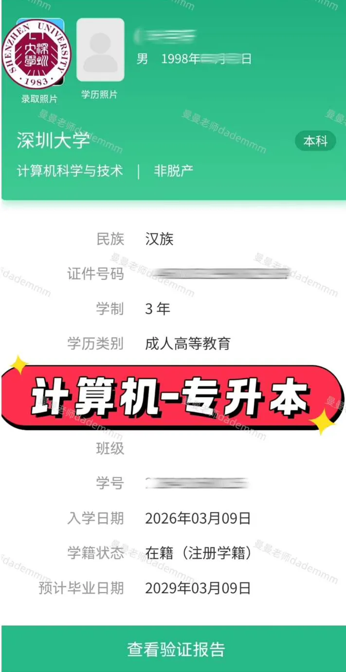 学籍关键信息:就读学校(如深圳大学)、学历层次(大专 / 本科)、专业名称、入学时间、预计毕业时间;