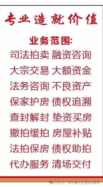 本公众号免费提供法拍房尽职调查,协助您挑选房源、排除风险、竞价策略、按揭贷款、解除查封、注销抵押、合理缴税、办证过户、清场收房等一条龙服务,不成功不收费,上市公司,专业团队,律师指导,让您安心捡漏法拍房。 另免费提供房屋编码、学区划分、学区锁定、入学积分、二手房历史成交、法拍房历史成交、二手参考价、租赁参考价、房贷计算器、提前还款计算器等各种实用查询工具&服务。 公众号在手,房产相关所有问题全搞定,有用就点个关注吧!