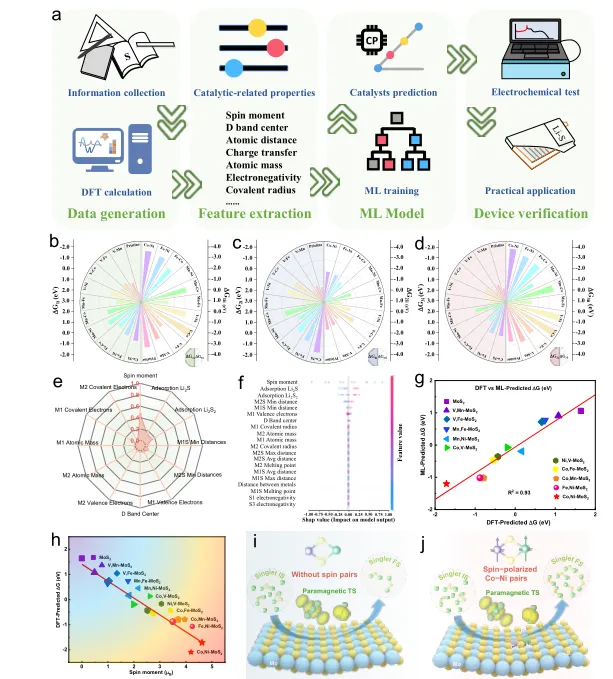 图1 催化剂自旋矩与催化活性的关联。 a 机器学习辅助催化剂筛选流程;b-d 三种可能反应路径中Li2S2→Li2S的吉布斯自由能雷达图;e SHAP特征重要性分析(自旋密度为最关键参数);f DFT计算与ML预测的ΔG对比(R2=0.93);g 自旋矩与ΔG的负线性关系;h,i 无自旋极化MoS2(慢动力学)与高自旋Co,Ni-MoS2(快动力学)的催化机理对比。