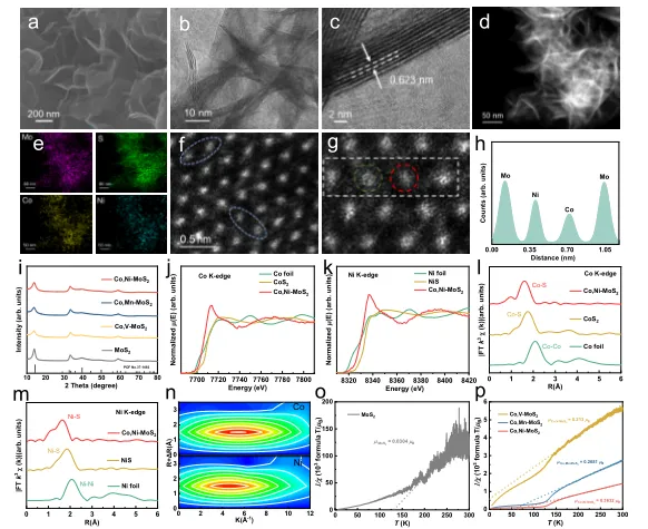 图2 Co,Ni-MoS2的微观结构与自旋表征。 a-c SEM、TEM、HRTEM图像(晶格间距0.623 nm对应MoS₂(002)面);d,e EDS元素分布(Mo、S、Co、Ni均匀分散);f,g HAADF-STEM图像(红/绿圈标记单原子Co、Ni取代Mo位点);h 线扫强度分布;i XRD图谱(保持2H相);j-m XANES和EXAFS证实Co-S、Ni-S配位;n 小波变换分析;o,p 磁化率曲线计算有效磁矩(Co,Ni-MoS2:0.3632 > Co,Mn-MoS2:0.2681 > Co,V-MoS2:0.2130 > MoS₂:0.0304)。