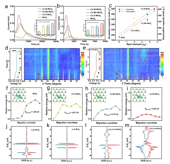 图3 Li₂S₂与Li₂S氧化还原动力学及自旋态调控机制。 a PITT测试Li₂S成核电流响应;b PITT测试Li₂S分解电流响应;c 成核/分解容量与自旋矩呈正相关(Co,Ni-MoS₂:449.6/398.5 mAh g⁻¹ vs MoS₂:182.5/221.5 mAh g⁻¹);d,e 原位XRD显示Co,Ni-MoS₂中Li₂S峰(26.7°)更快出现且强度更高;f-i Li⁺扩散能垒计算(Co,Ni-MoS₂:0.26 eV,远低于MoS₂的1.09 eV);j-m DOS分析:无自旋MoS₂使Li₂S₂/Li₂S保持对称自旋态(仍存在自旋转变能垒),而Co,Ni-MoS₂诱导不对称自旋态,实现自旋-自旋跃迁通道,直接降低能垒。