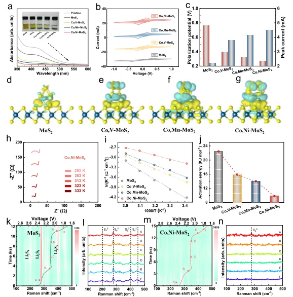 图4 多硫化物吸附与穿梭抑制。 a Li₂S₆可视化吸附实验(Co,Ni-MoS₂溶液颜色最浅)及UV-vis光谱;b 对称电池CV曲线(Co,Ni-MoS₂电流响应最高);c 峰值电流与极化电压对比;d-g Li₂S₄吸附差分电荷密度(Co,Ni-MoS₂中Li-S键电子密度最高);h 不同温度下EIS Nyquist图;i Arrhenius拟合;j 活化能Eₐ(Co,Ni-MoS₂:9.79 kJ mol⁻¹,远低于MoS₂的22.45 kJ mol⁻¹);k-n 原位拉曼光谱:MoS₂电池中多硫化物信号持续存在,而Co,Ni-MoS₂电池中信号迅速消失。