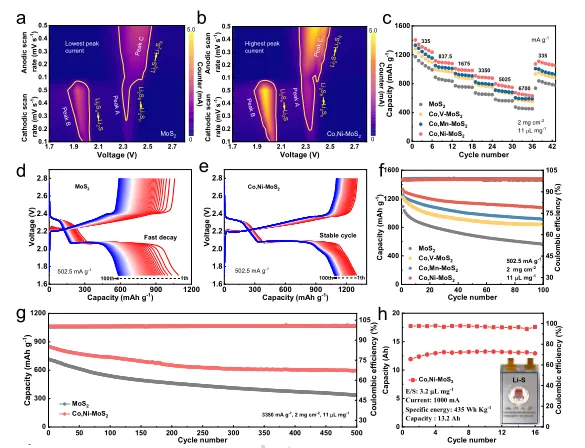 图5 锂硫电池电化学性能。 a,b 不同扫速CV曲线;c 倍率性能(Co,Ni-MoS₂在335、1675、6700 mA g-1下容量分别为1235、982、631 mAh g-1);d,e 100圈充放电曲线对比(MoS₂ vs Co,Ni-MoS₂);f 循环性能(Co,Ni-MoS₂:100圈后1077.5 mAh g-1);g 500圈长循环(3350 mA g-1,Co,Ni-MoS₂保持595.1 mAh g-1);h 软包电池循环性能(13.2 Ah,435 Wh kg-1,E/S=3.2 µL mg-1)。