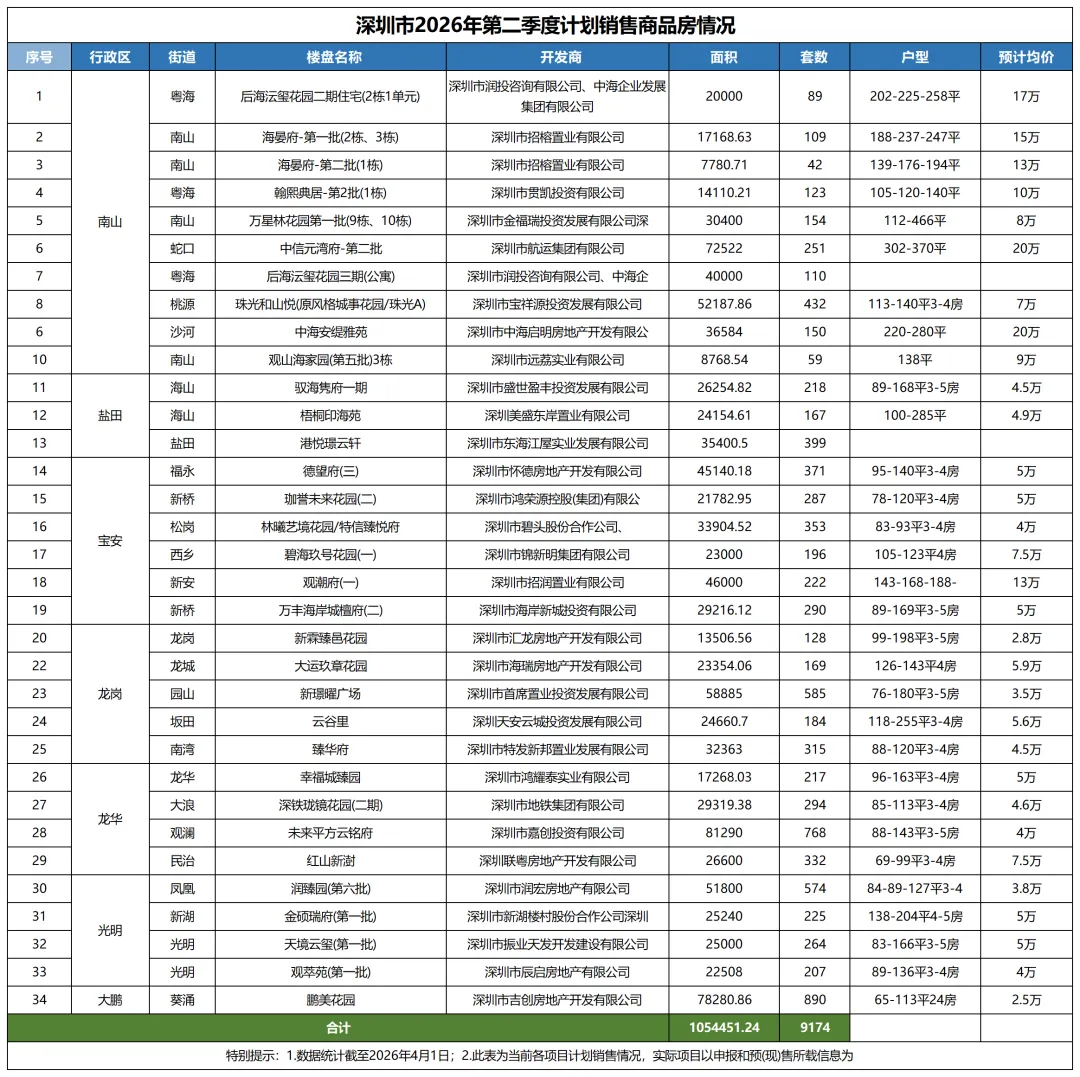 2026 年二季度深圳计划预售商品房总建面约122.68 万㎡,共计10909 套,供应规模较一季度大幅回升: