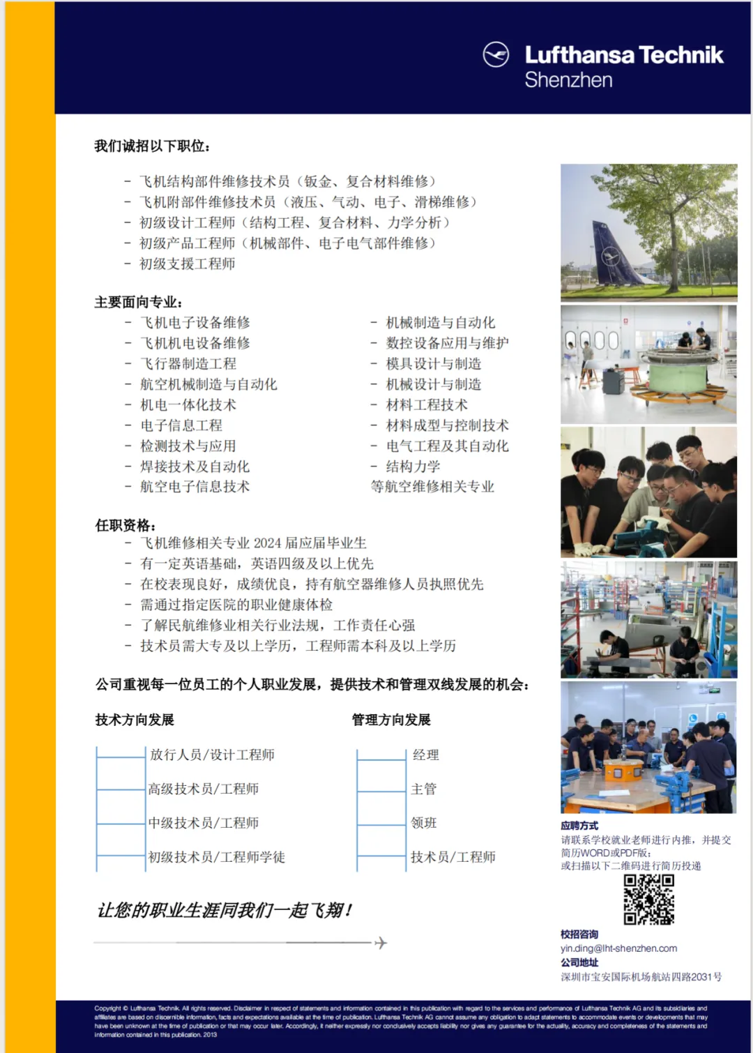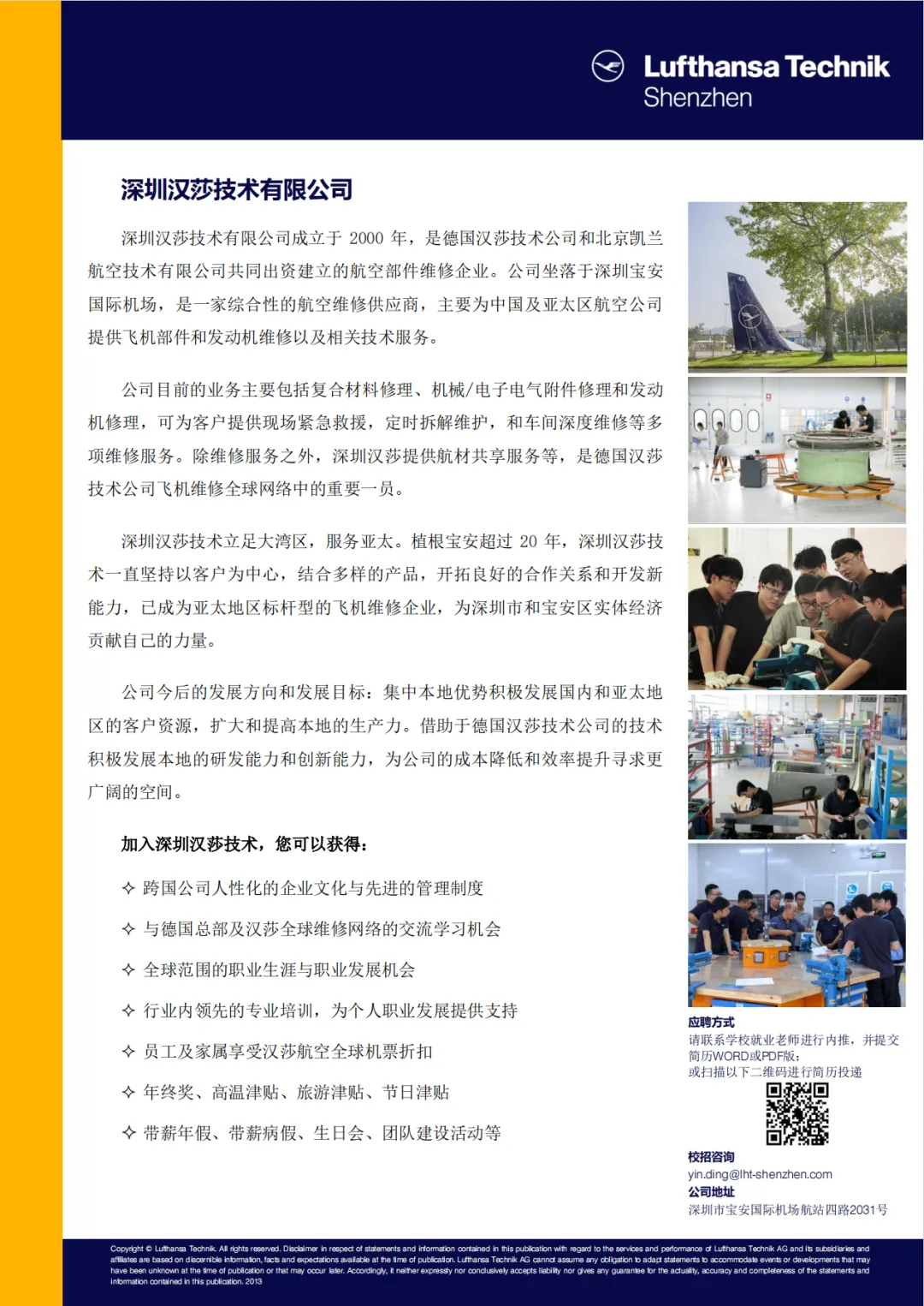 深圳汉莎技术有限公司是由德国汉莎航空技术公司(80%)、北京凯兰航空技术公司(20%)共同投资建立的航空部件维修中心。成立于2000年10月17日位于深圳市宝安区宝安国际机场航站四路2031号汉莎基地。我们的目标是在中国建立一个先进的飞机维修基地利用德国汉莎技术公司统一的质量标准和服务标准为东南亚地区的运营商甚至世界其他地方提供维修、检修服务。我们拥有四个业务部门: 机体结构部件(ARC)采用精湛的工程技术为发动机反推、发动机整流罩、雷达罩、飞行操纵舵面以及其它复合材料结构部件提供一流的维修、修理和大修服务;飞机部件服务(COM)迅速回应客户的各种维修需求以及对相关有效证书的要求,提供物流及客户服务,并提供液压、气动、机械、电子、电气、轮毂,救援设备部件的维护、修理、大修服务和工程支援;发动机服务(ENS)提供发动机部件的检测和交换等服务;物流服务(LOG)为客户提供快捷高效的物流服务
